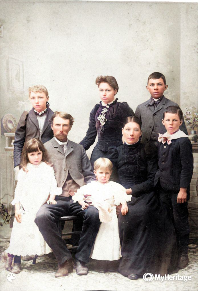 Around 1892 this family photo includes most of the siblings of Grace (Nanny) Gentry. In the back row are Maud, Edna and Cleveland (Tebe). The cute girl next to her father Clark is Grace, with her young sister Alberta (Bert) on his other side. Their mother Sarah Emaline (Em) is beside (Joseph) Dale. The oldest daughter Edna will die of TB in 1895 at the age of 18. A son named Samuel Marcus (Mark) died in 1886 of burns from a laundry accident.